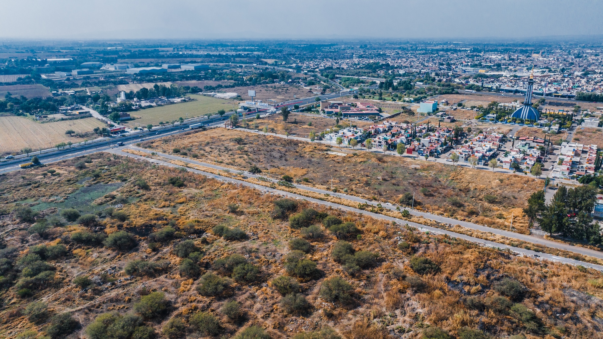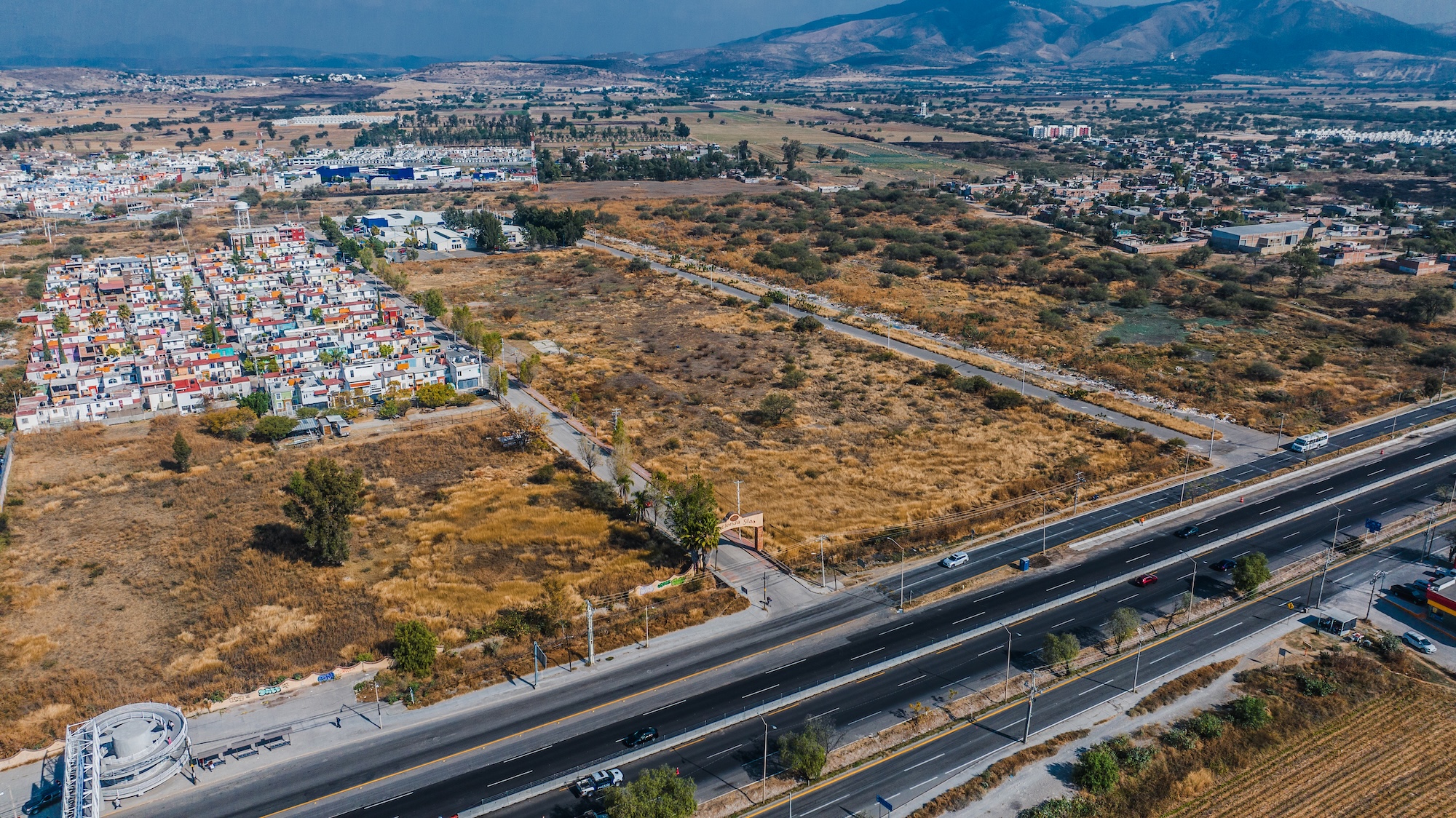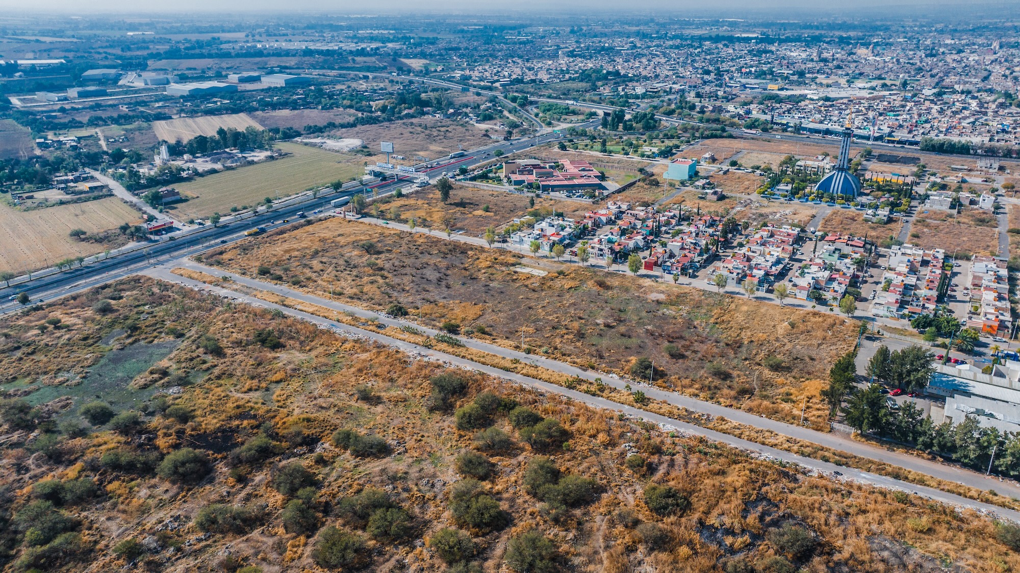 Terreno rectangular de 35,607 m² con frente de carretera federal, ubicado en la zona de mayor crecimiento del Bajío. A 10 minutos del Aeropuerto Internacional y del complejo industrial Puerto Interior. Lotificación aprobada y lista para desarrollar.